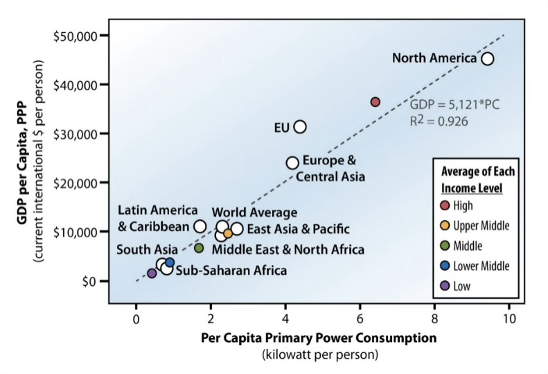 About 93% of the variation in per capita wealth production (GDP per capita) between different countries can be explain by access too energy—the power they consume–as seen in Figure 1 below.